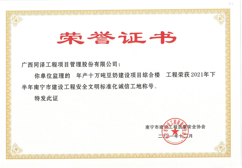 年產(chǎn)十萬噸豆奶建設(shè)項(xiàng)目綜合樓項(xiàng)目榮獲2021年下半年南寧市建設(shè)工程安全文明標(biāo)準(zhǔn)化誠信工地稱號