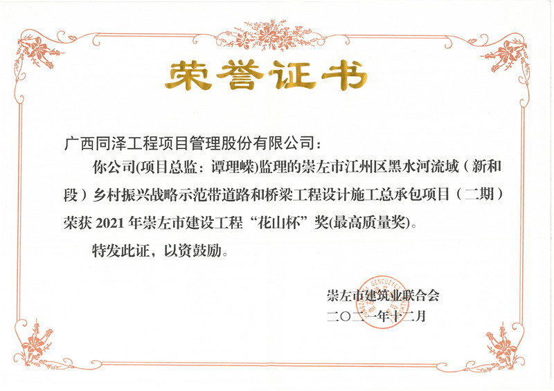 崇左市江州區(qū)黑水河流域(新和段)鄉(xiāng)村振興戰(zhàn)略示范帶道路和橋梁工程設(shè)計施工總承包項(xiàng)目(二期)項(xiàng)目榮獲2021年崇左市建設(shè)工程“花山杯”獎(最高質(zhì)量獎)
